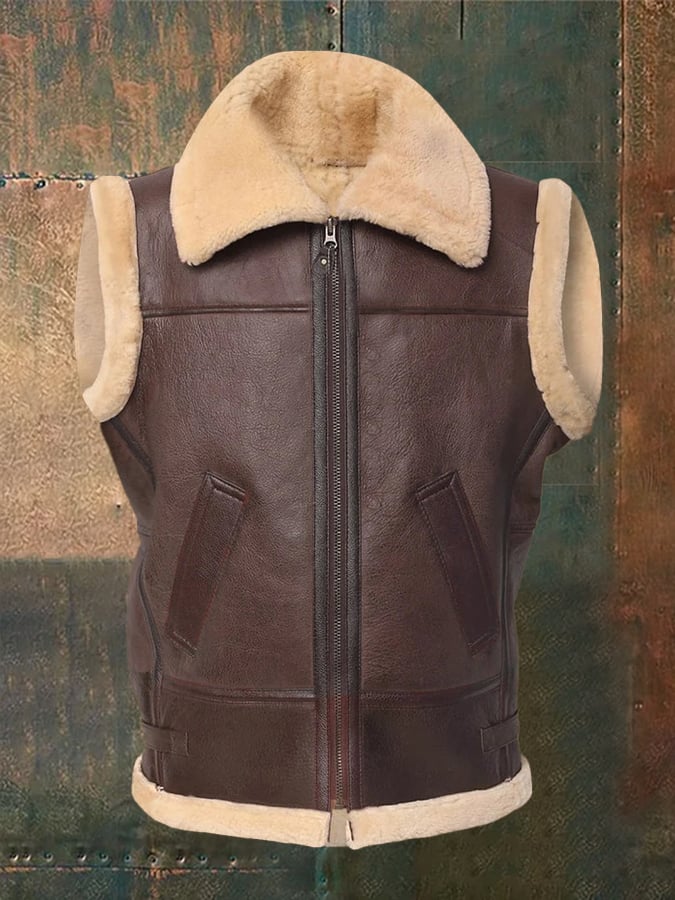 Men's Vintage Casual Lapel Zipper Faux Fur Leather Moto Vest