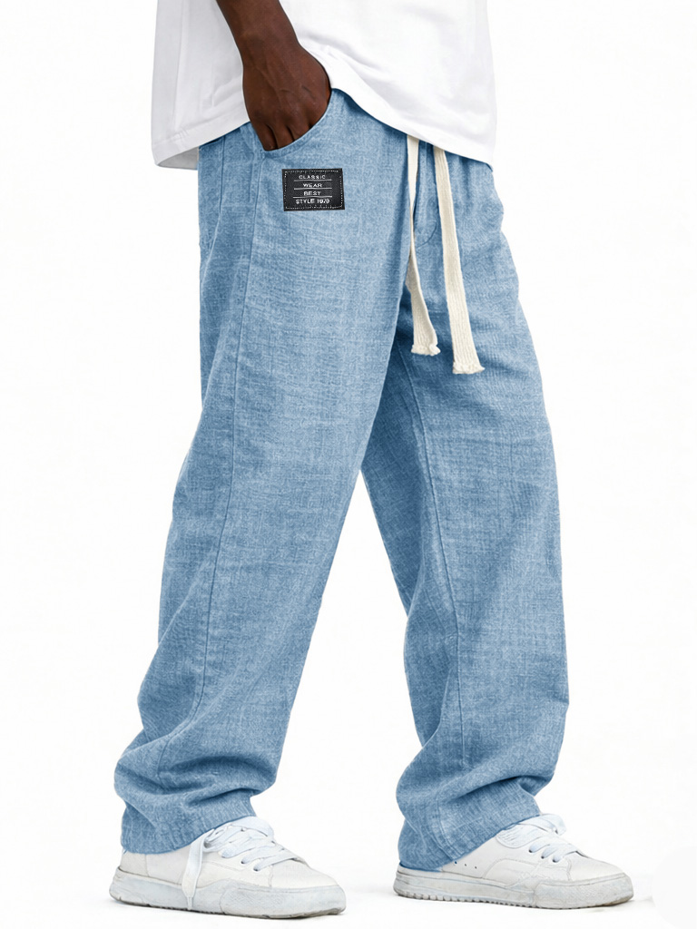 Men's Breathable Linen Pants Resort Casual Loose-Fit Trousers with Embroidered Leather Patch