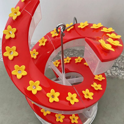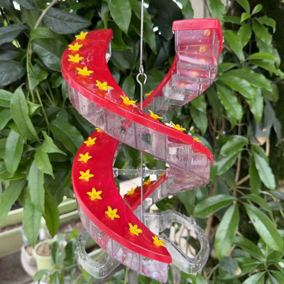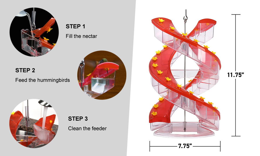 32 Futteröffnungen sind in einem spiralförmigen Pfadangeordnet, der Kolibris dazu bringt, länger zu bleiben. Die helikale Form ahmt Blumencluster in der Natur nach und passt besser zu ihren instinktiven Fressmustern.Er kann