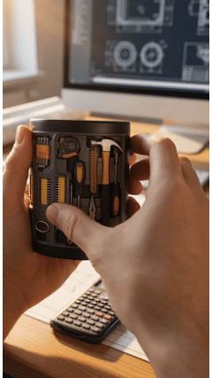 This mug features a fully equipped toolbox embedded on its surface—complete with a hammer, screwdriver, pliers, measuring tape, and various small parts. It looks like a miniature toolbox that you can drink from, giving you a feeling of being a true DIY enthusiast with every sip.