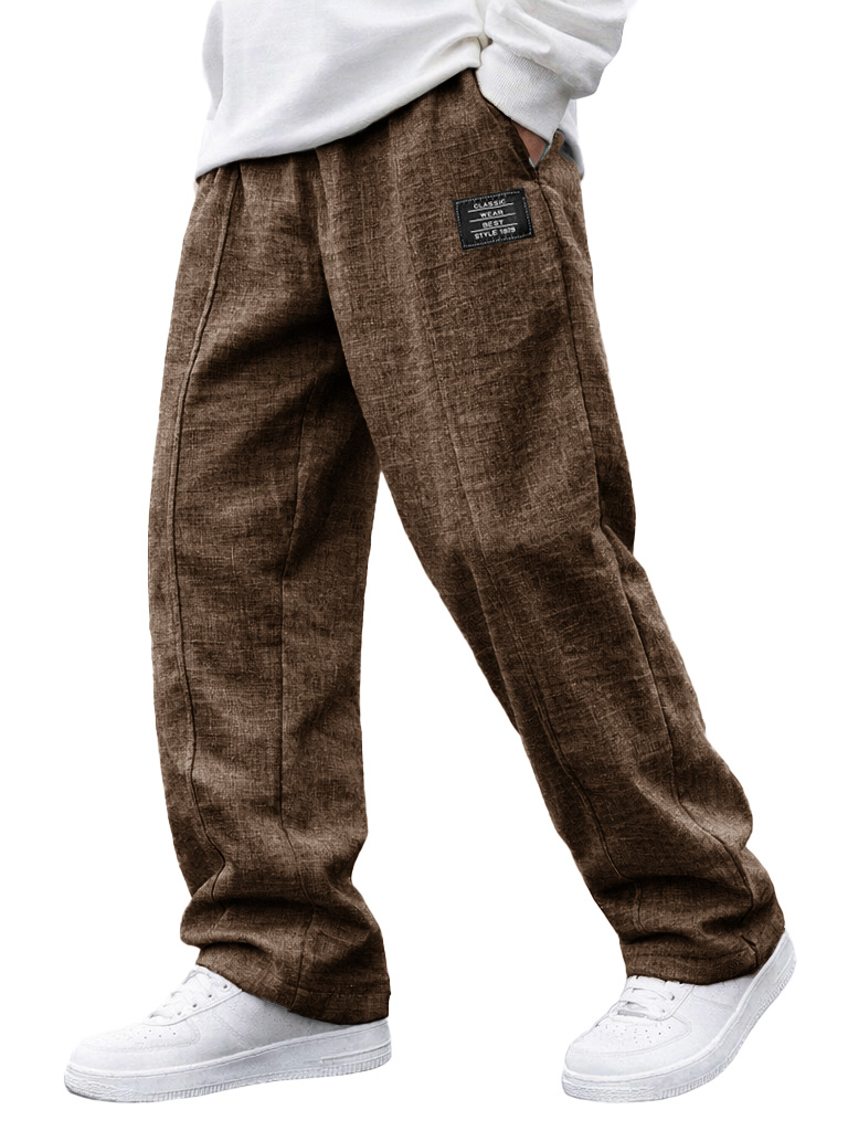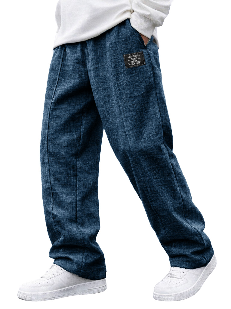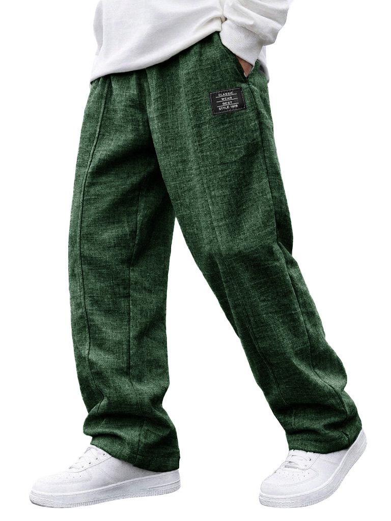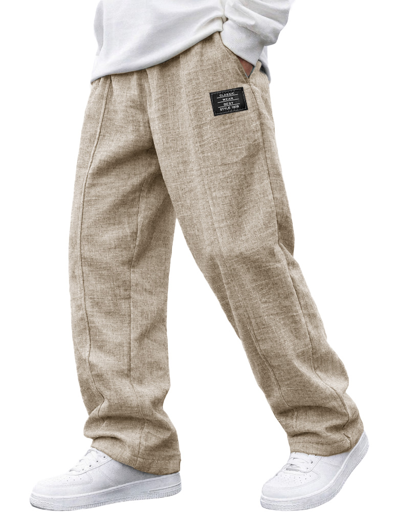 Men's Fashionable Casual Linen Pants with Elastic Waist, Embroidered Logo Pockets