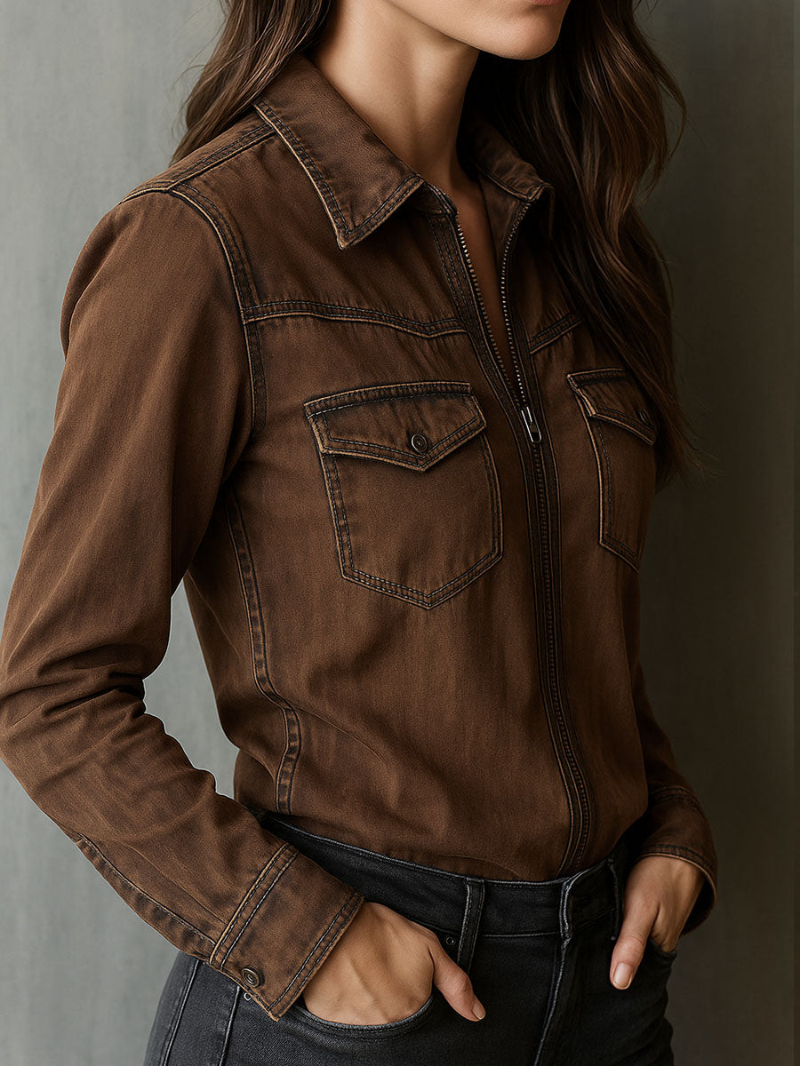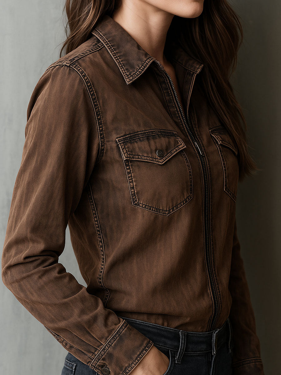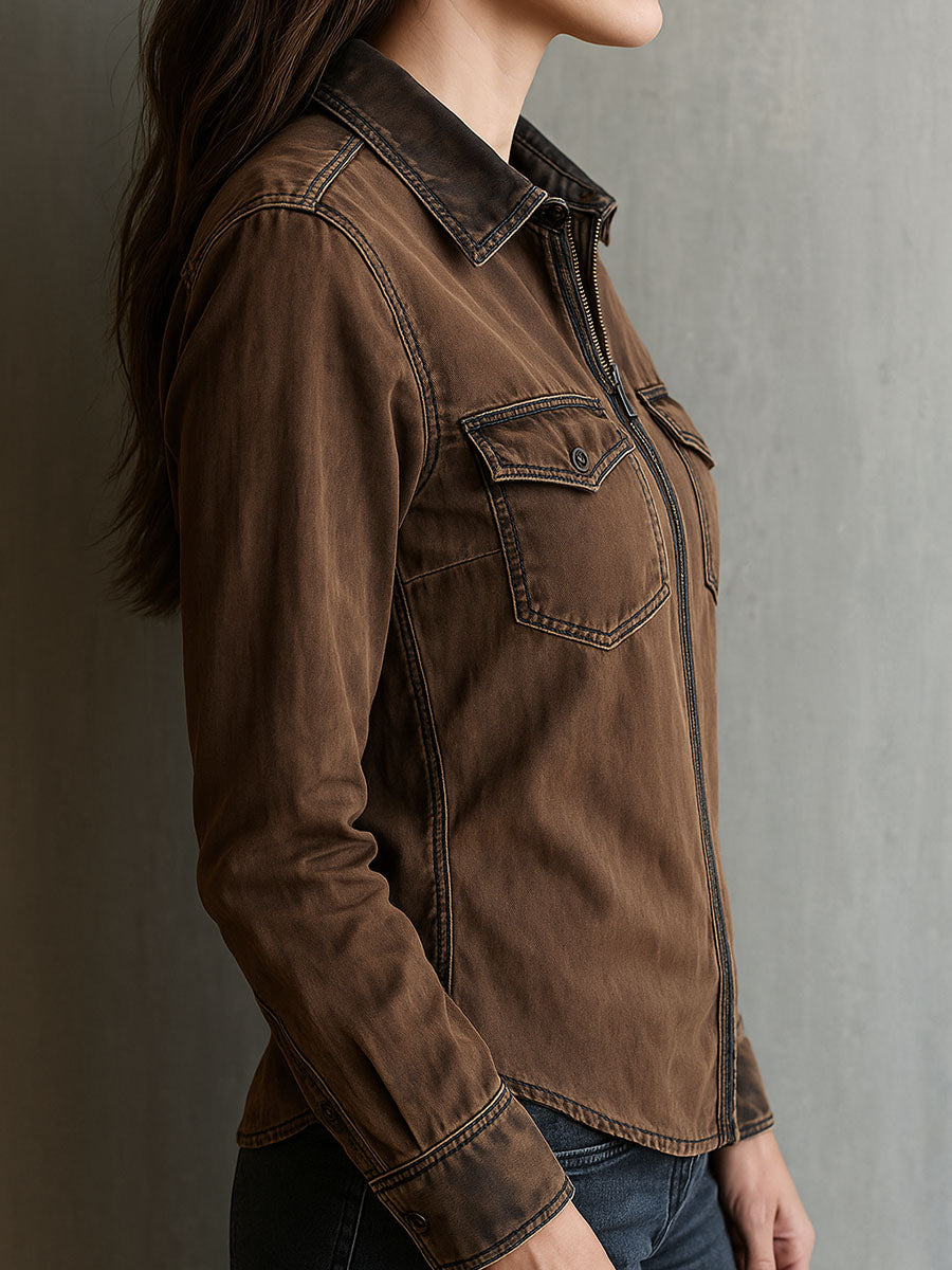 Product DescriptionThe Vintage Brown Washed Contrast Stitching Utility Zip Shirt Jacket effortlessly combines rugged utility with timeless style. Crafted with a unique vintage brown wash, this shirt jacket exudes a classic yet bold appeal. The distinct contrast stitching adds an element of detail, making it stand out among conventional utility shirts. Its versatile design includes a front zip closure for convenience and functionality. | ||